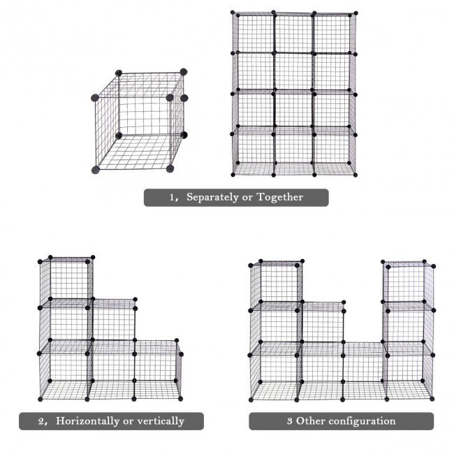 High quality and brand newCombine multiple sets for additional storageOpen wire construction permit air circulationMade from steel wire painted black and matching heavy duty plastic connectorsReal DIY storage cubeMulti-function storage and displayHigh capacity organizedEasy assemble and disassemble for using and storing